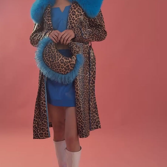 Blue Faux Suede Trench Coat with Faux Fur Collar